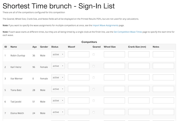 If you want to assign Heats/Lanes to the competitors at the last minute (e.g. at the track) you can print a paper copy of all of the people who are signed up for the event, and then assign them to heats/lanes using a laptop at the track.
